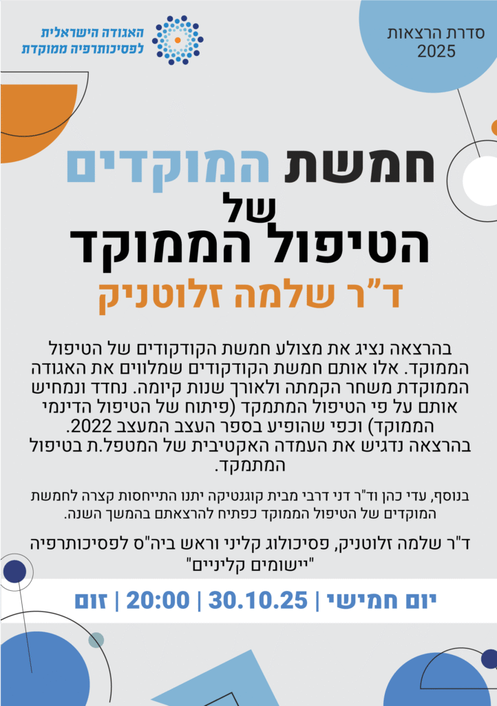 בנוסף, עדי כהן וד"ר דני דרבי מבית קוגנטיקה יתנו התייחסות קצרה לחמשת המוקדים של הטיפול הממוקד כפתיח להרצאתם בהמשך השנה.